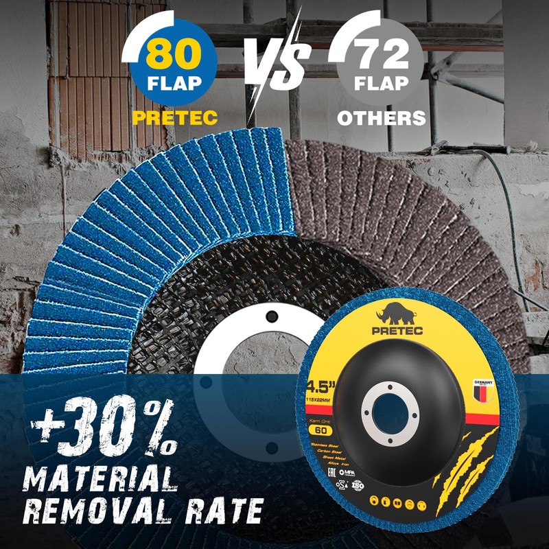 - ✨【Premium Material】PRETEC flap sanding discs are crafted from high-density premium zirconia abrasive, ensuring strength, durability, and extended disc life. They are designed to withstand high temperatures and pressure for optimal performance.