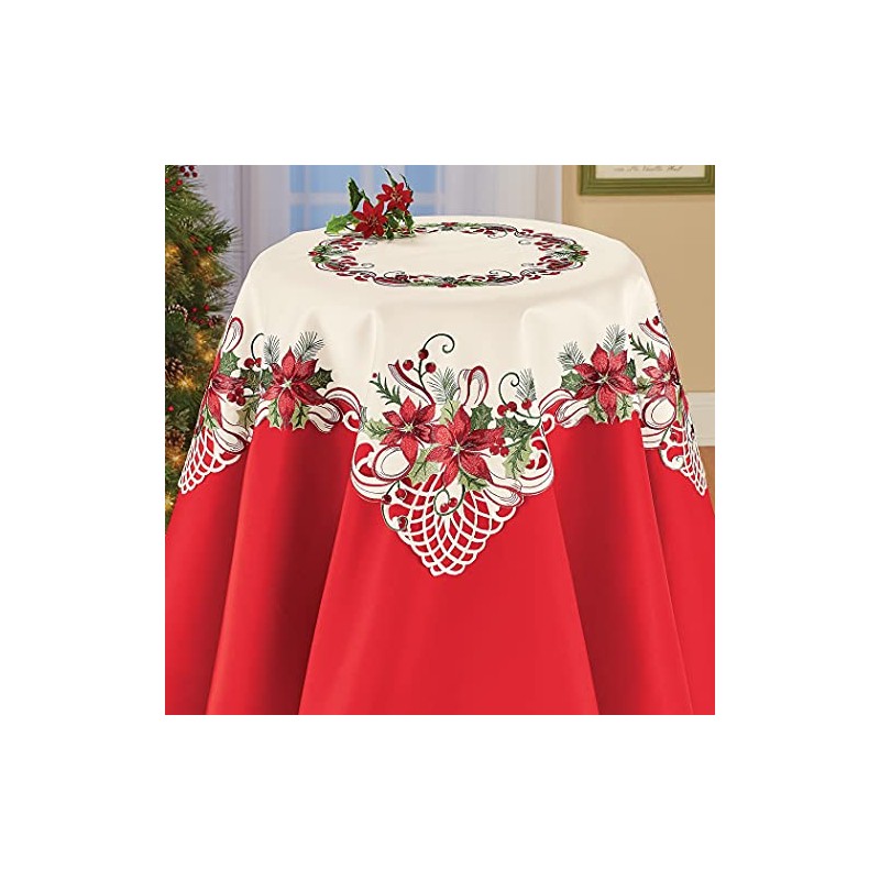 - These beautiful table linens feature embroidered red poinsettias, holly leaves, berries and intricate cutwork