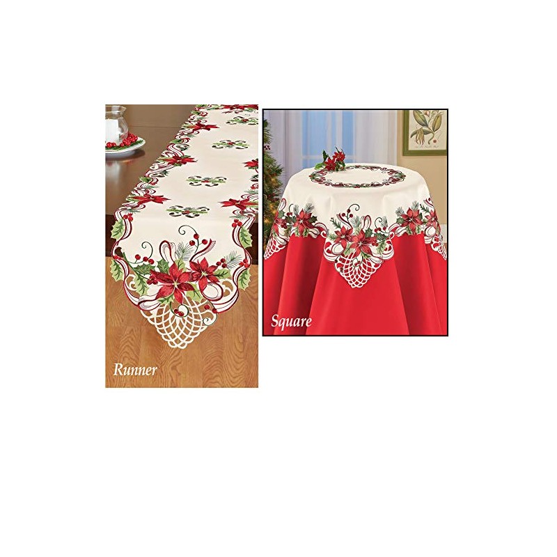 These beautiful table linens feature embroidered red poinsettias, holly leaves, berries and intricate cutwork. Perfect on their own or over a coordinating tablecloth underneath (sold separately). Machine wash. Polyester; imported. Size available in Runner (67 7/8"L x 13 1/4"W) or Square (34"Sq.).