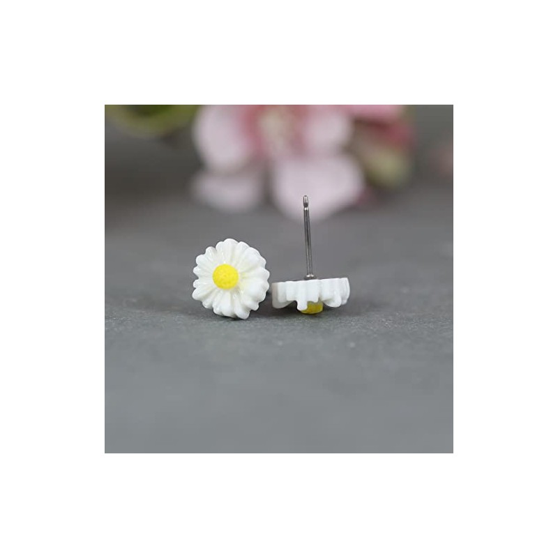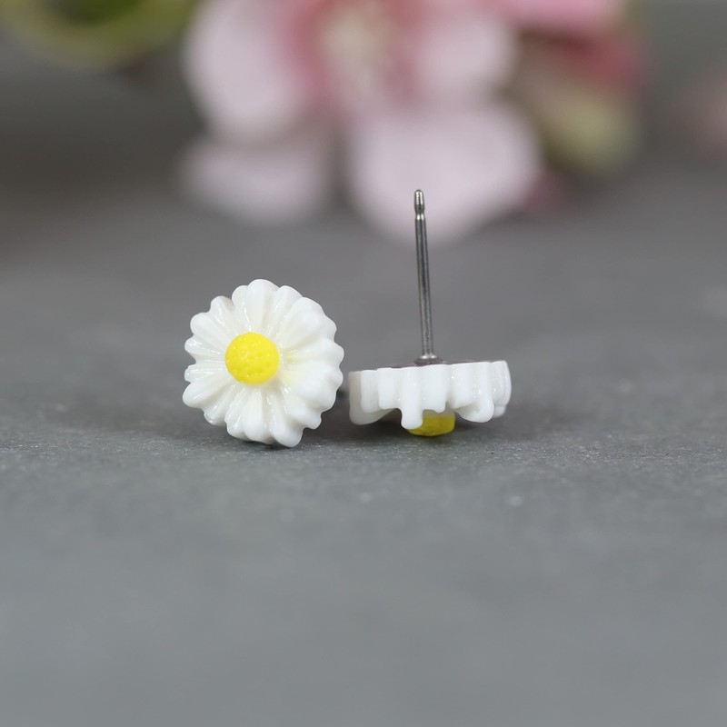 Our popular daisy earrings are now available on hypoallergenic titanium posts! Fresh white daisies with a bright yellow centre are perfect for spring!
