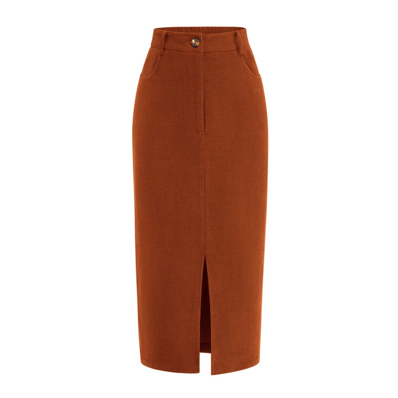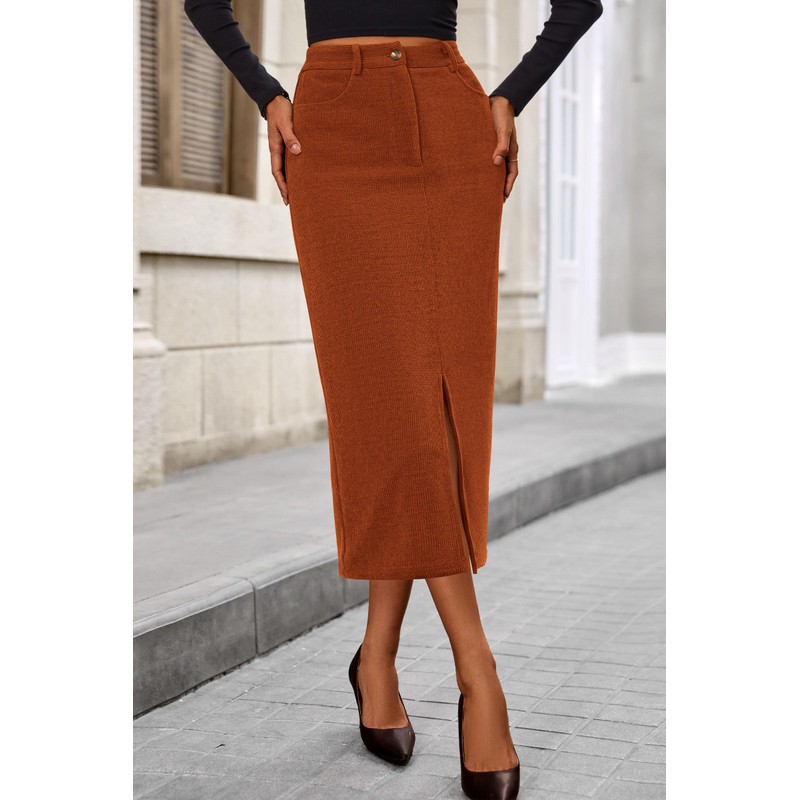 - Classic Corduroy Skirt: The Straight Fit And High Waist Design Accentuate your Curves. The Mid Length and Slit Detail allow you to show off some skin while maintaining an elegant look. The Convenient Pockets Add a Practical Element to this Stylish Piece