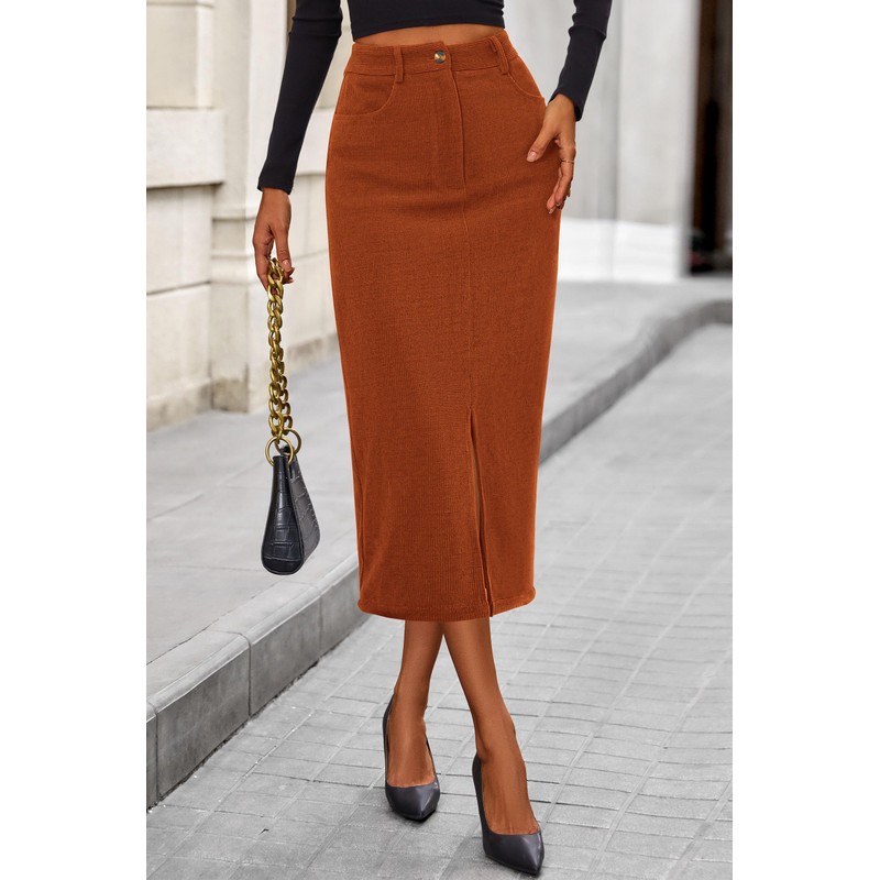 Fashion Style: High Waisted/Mid Length/Front Slit/Pockets