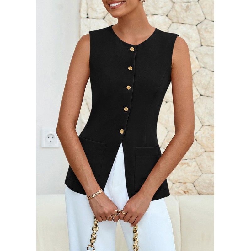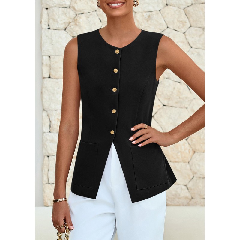 - Vest Tops For Women Features Sleeveless,Split Hem,Open Front,Button Down.Transform Any Outfit Into A Tailored Ensemble With This Suit Vest That Adds A Touch Of Refinement And Class.Enhance Your Feminine Silhouette With Blazer Vest,Creating An Elegant Look