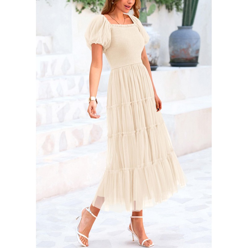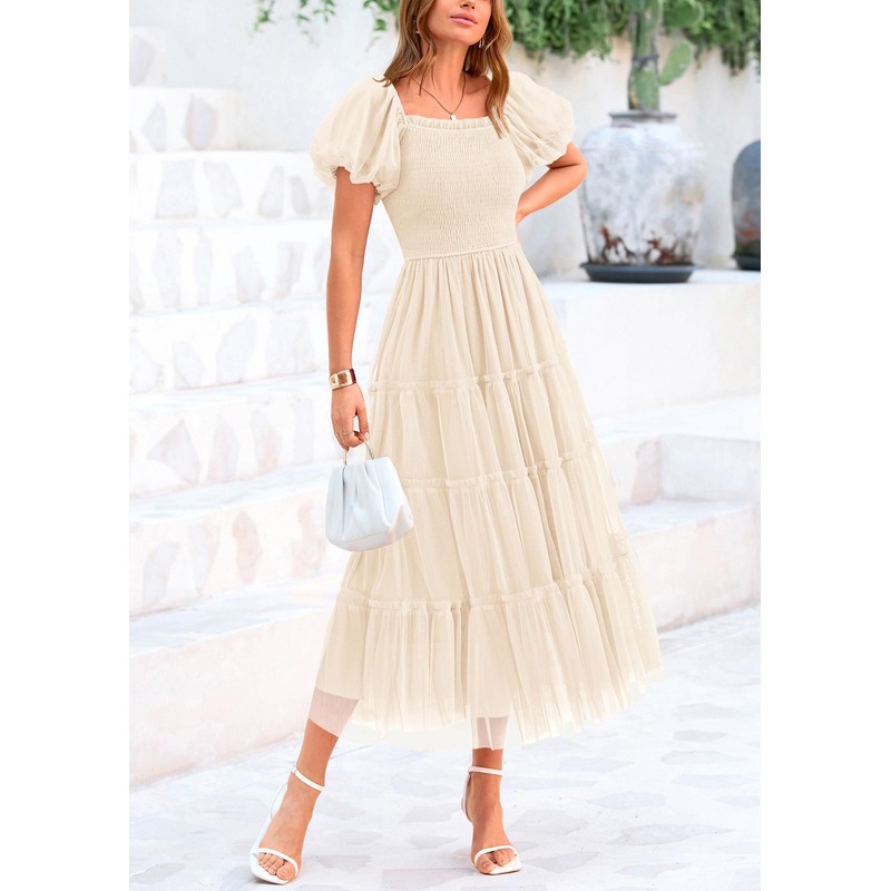 PRETTYGARDEN Women's Smocked Midi Tulle Dress 2025 Summer Puffy Short Sleeve Square Neck Ruffle Wedding Guest Party Dresses (Beige,XX-Large)