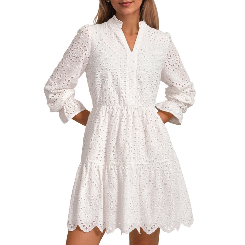 - SIZE GUIDE: S=US 4-6, M=US 8-10, L=US 12-14, XL=US 16-18, XXL=US 20. Elegant Dresses for Women Made of Delicate Eyelet Pattern Fabric, Setting it Apart from Other Plain Designs. Premium Embroidered Material Offers a Luxurious Feel to the Short Dress