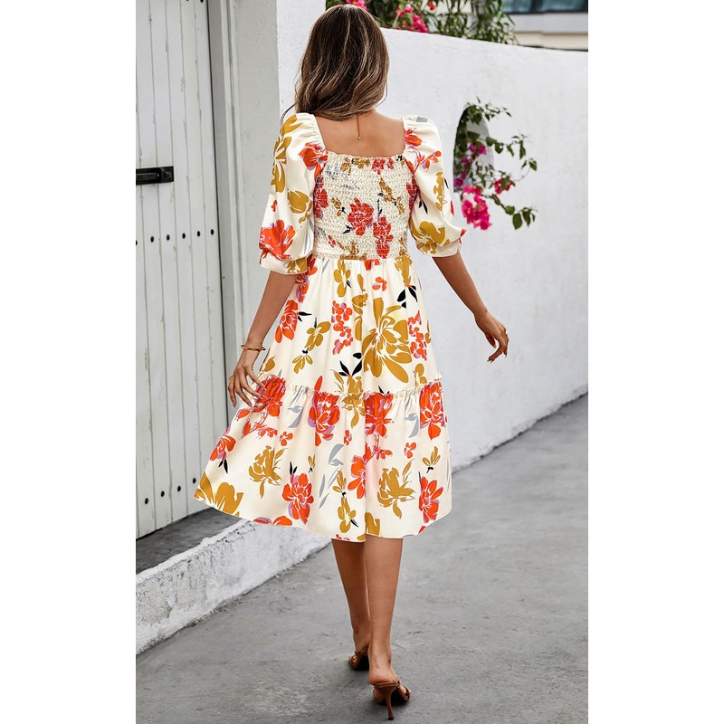 PRETTYGARDEN Women's Summer Casual Midi Dresses 2025 Spring Puff Sleeve Square Neck Flowy Tired Ruffle Boho Floral Smocked Dress (Apricot Yellow Red Flower,XL)