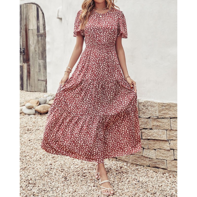 - Unique Features: Woman Round Neck Floral Maxi Dress / Short Flutter Sleeve / Elastic Shirred Waist / Smocked High Waisted / A-Line / Flowy Tiered Swing Ruffle Hem / About Ankle Length / Button Closure At Back / Bohemian Ditsy Floral Print / No See Through / Elegant Cute Trendy Vintage Style / Spring Dress For Women 2025 / Summer Beach Long Dress / Sage Dress For Women / Modest Dress / Wedding Guest Dresses For Women / Size:S, M, L, XL / S=US 4-6, M=US 8-10, L=US 12-14, XL=US 16-18, XXL=US 20