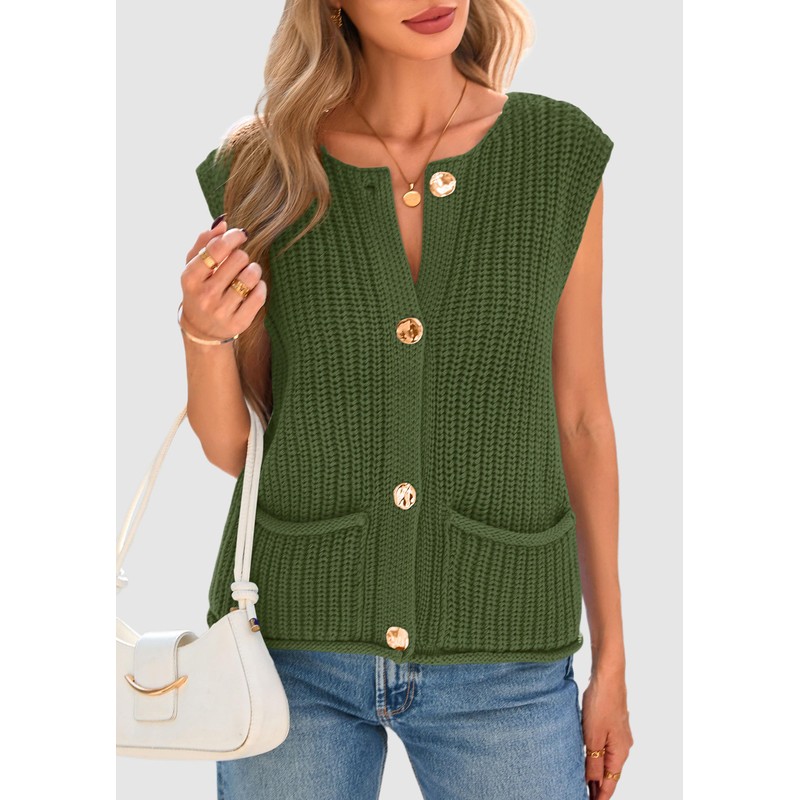 Fashion Style: Solid Color, Button Down, Sleeveless, Crew Neck, Loose Fit, Chunky Knit, Cropped Length, Pockets