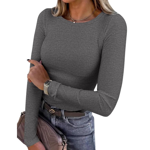 PRETTYGARDEN Womens 2025 Summer Fall Long Sleeve Shirts Ribbed Knit Fitted Basic Tee Going Out Tops Underscrub Casual Outfits (Charcoal,Small)