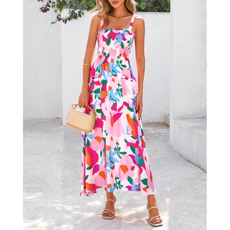 - Features: Casual Long Summer Dress 2025 / Floral Print Dress / Square Neck Dress / Adjustable Straps / Sleeveless Midi Dresses / Ruffle Trim / A Line Dress / Flowy Sundresses For Women / Smocked Maxi Dress / Maxi Dresses With Front Pockets / Elastic High Waist Dress / Fit And Flared Dress / Dresses For Women 2025 Elegant Classy