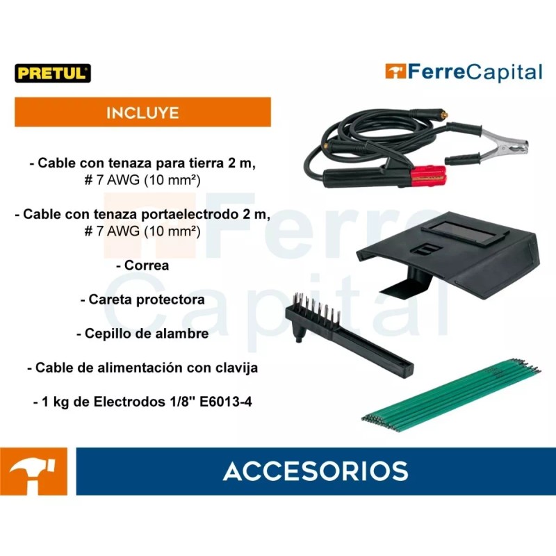- Accesorios incluidos: Pinza de masa, Pinza porta electrodo, Correa de hombro, Máscara, Cepillo 2 en 1, 1 kg de electrodos 1/8" E6013-4