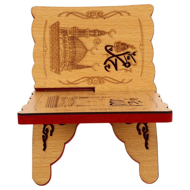 PRETYZOOM Islam Eid Books Shelf Wooden Eid Mubarak Prayer Book Stand Koran Holy Bible Books Storage Display Rack Ramadan Reading Shelf for Mubarak Muslim Party Ornament 20x14CM
