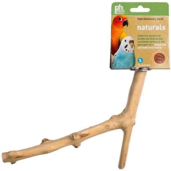 Prevue Pet Products is cut from trimmed branches of coffeawood trees. Coffeawood (java) is an ultra-hard wood and has long-lasting durability. The irregular shape and diameter of the branch provides exercise for feet as birds walk and climb up, down and around the perch. Dimensions: (length) 9" • (diameter range) 1/2" — 1"