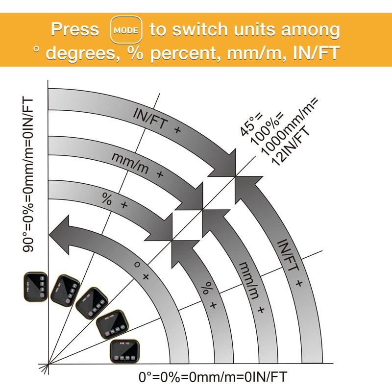 - 【High Accuracy and 4 Measuring Units】 The angle gauge is designed for an accuracy of ±0.1°at 0°-90°,±0.2°at other angles,and a resolution of 0.05°.It's offers 4 selectable units of angle measurement:degree,mm/m,%,in/ft.