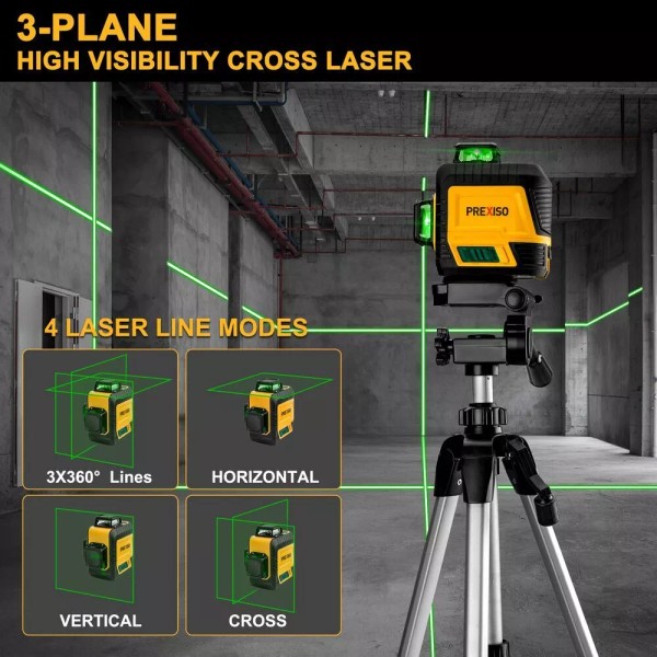 - 5 Leveling Modes & 3 x 360° Full Green Laser Layout - 1 x 360° horizontal and 2 x 360° vertical beam easily projects line cover all around the room. PREXISO three-pane leveling laser tool with 5 leveling modes, you can easily switch to any laser you want