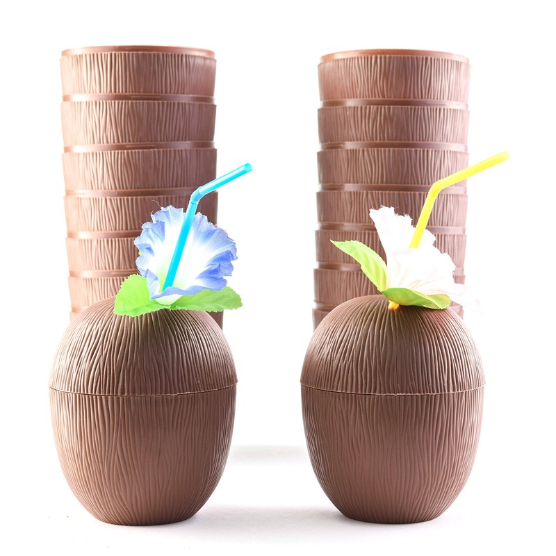 - 18 x Coconut-shaped plastic cups with lids that can be affixed on top of each cup