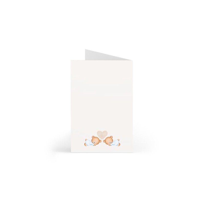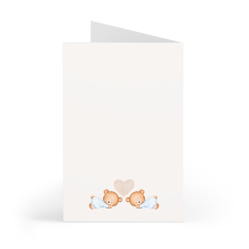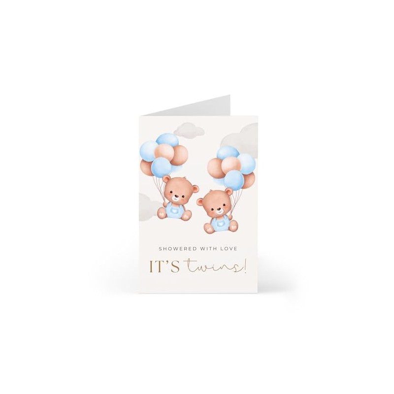 - This charming 5x7 folded card features sweet illustrations of two bears surrounded by blue balloons and the heartfelt message "Showered with love - It's twins!" in the front.