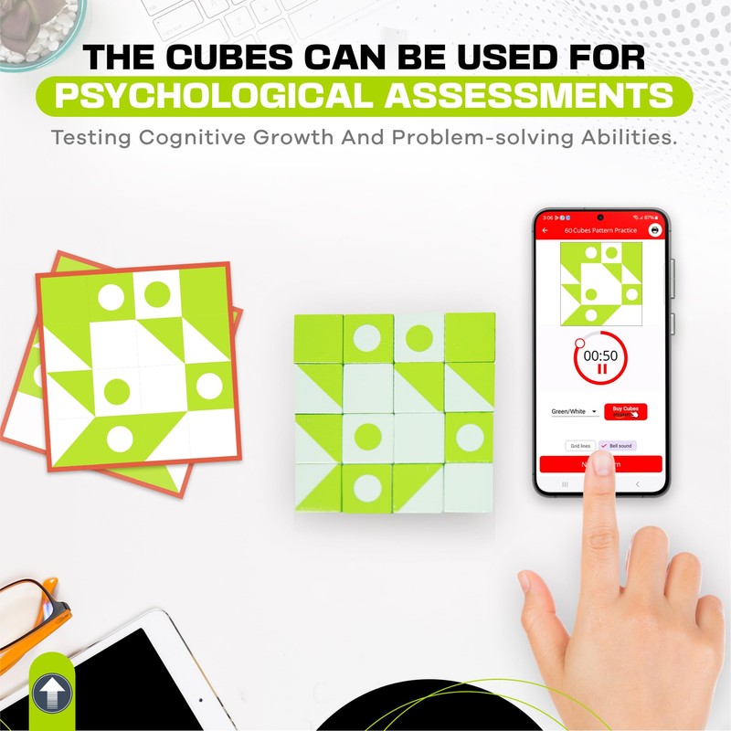 PrfcNL IQ Test Cubes (Green and White) – 16 Cubes with Mobile app and Pattern Cards for Block Design Test, WAIS IV and WISC V Tests, Improve Memory and Concentration