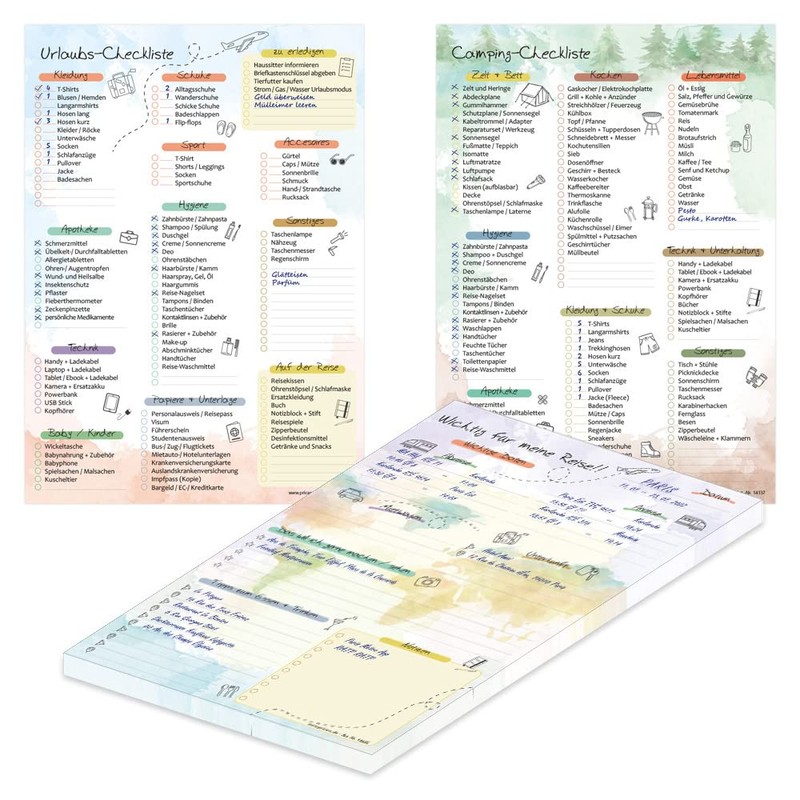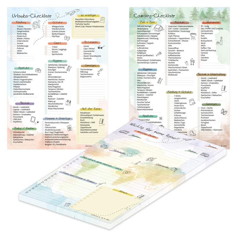 • Contents: 3 pads/format: DIN A4 (210 x 297 mm) / 1 holiday checklist, 1 camping checklist, 1 travel planner