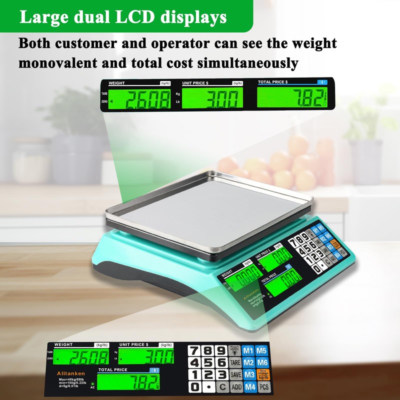 - Dual-High Light LCD Display Shows: Weight, Unit Price, and Total Price Shown Simultaneously of the Front and Back Operator and Customer Displays. It is easy for sellers or customers to know how many or how much of the produce is on the tray and how much it cost, so that you and your customers can build a higher level of trust and make your sales more efficient.