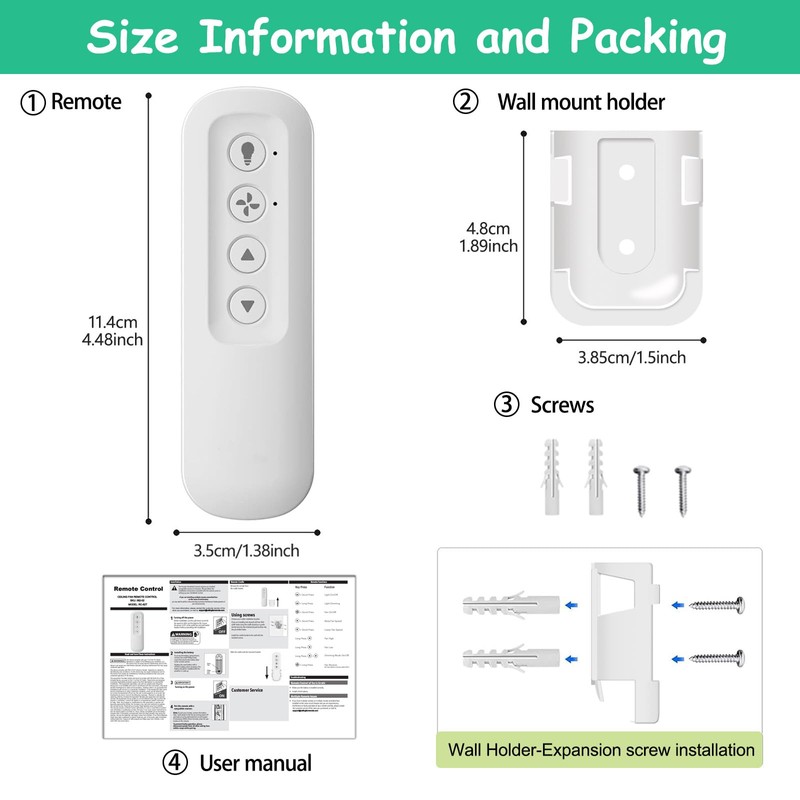 - Package --- Includes Remote Control*1, Wall Mount Holder*1, User Manual*1, Screws*2. This ceiling fan remote control use a 3V battery (NOT INCLUDE) for power supply.
