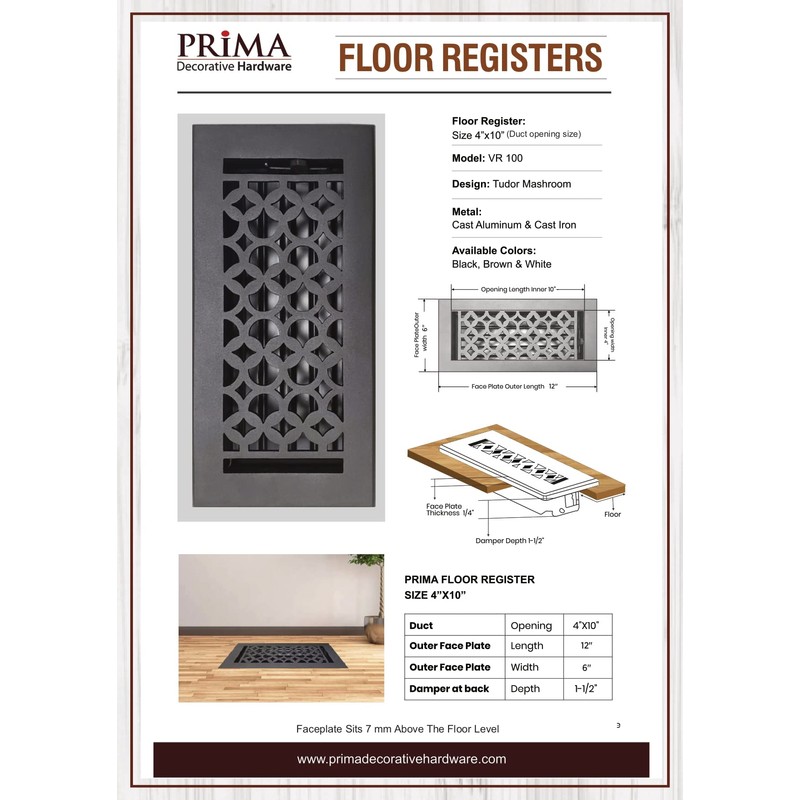 The Prima Decorative Hardware are the elegant Floor Register features high-quality, made of durable rust-free cast aluminium, handcrafted, and finished. used to cover floor vent duct openings for AC, Heat & HVAC systems Our design delivers a traditional look and ensures rattle free and quiet heat or cold airflow from your central air system to the room while providing easy opening and closing with attached dampers at the back. Our Handcrafted and hand-finished 4″ X 10″ size fits most Standard air ducts opening sizes for floors, walls, and ceilings and are for indoor use. The material which has been used is durable cast aluminium. The damper is removable and adjustable to control airflow and make it safe. Our Floor registers are made beautifully and built to last long. These floor registers will add a touch of modern elegance to any room for a long duration. Cleaning the floor register is very easy. All our floor registers are powder coated and are durable. It can be cleaned by just brushing dry, if after a few years you see any colour difference or get dull or want to change the colour you can get them re-painted using metal paint spray available in the market. These floor registers come in Cast Iron, which can be used for heavy traffic floor areas. The same design is available for large size Air return grills for walls and ceiling, without dampers, comes with countersunk holes and matching screws.