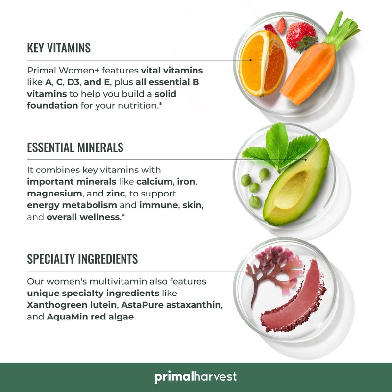 🌟 ⭐ Primal Harvest Mujeres +, Multivitamínico Vitamina A, Vitamina C, Vitamina D y E, Vitamina B12, B6, Biotina, Suplementos de zinc, 1 paquete de 60 cápsulas ⭐ 🌟