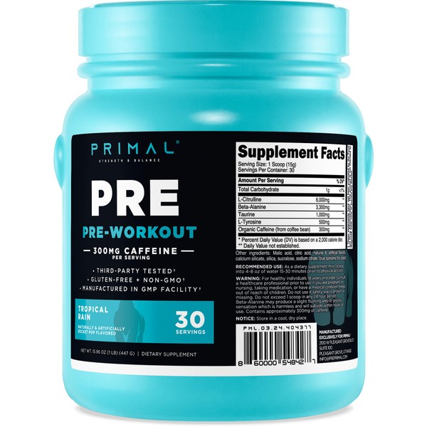 Primal Pre-Workout Tropical Rain (30 Servings) (Rocket Pop Flavored) - Gluten Free & Non-GMO