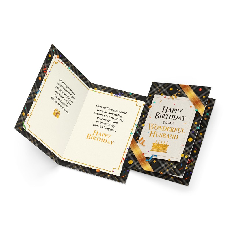 - Front Message: Happy Birthday To My Wonderful Husband Inside Message: On this special day, I want to remind you just how deeply you are loved. Not just for what you do, but for who you are. I am endlessly grateful for you, and today, I celebrate everything that makes you so beautifully, wonderfully you. Happy birthday.