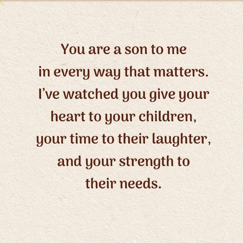 - Inside Message: You are a son to me in every way that matters. I’ve watched you give your heart to your children, your time to their laughter, and your strength to their needs. I’m proud to call you family and grateful for the care and love you bring into this world. Happy Father’s Day!