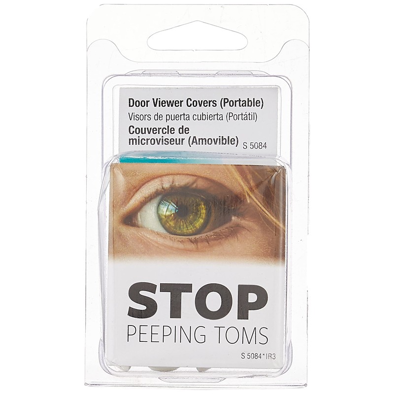 These door viewer privacy covers are constructed of plastic and come white in color. Both privacy covers feature a large 1-7/16 in. outside diameter cover for privacy and easy gripping during insertion and removal from a door viewer peephole. Each package contains two privacy covers, one with a 3/8 in. outside diameter stem and one with a 7/16 in. outside diameter for use with larger viewers. This portable security device provides privacy against the use of reverse peephole spy tool lenses, like cameras, scopes and phone apps. Portable door viewer privacy covers like these can be used on hotels when traveling, on apartment doors, office doors, service doors, homes, dorms, etcetera. For a non-portable, fixed door viewer privacy cover see model # S 5087.