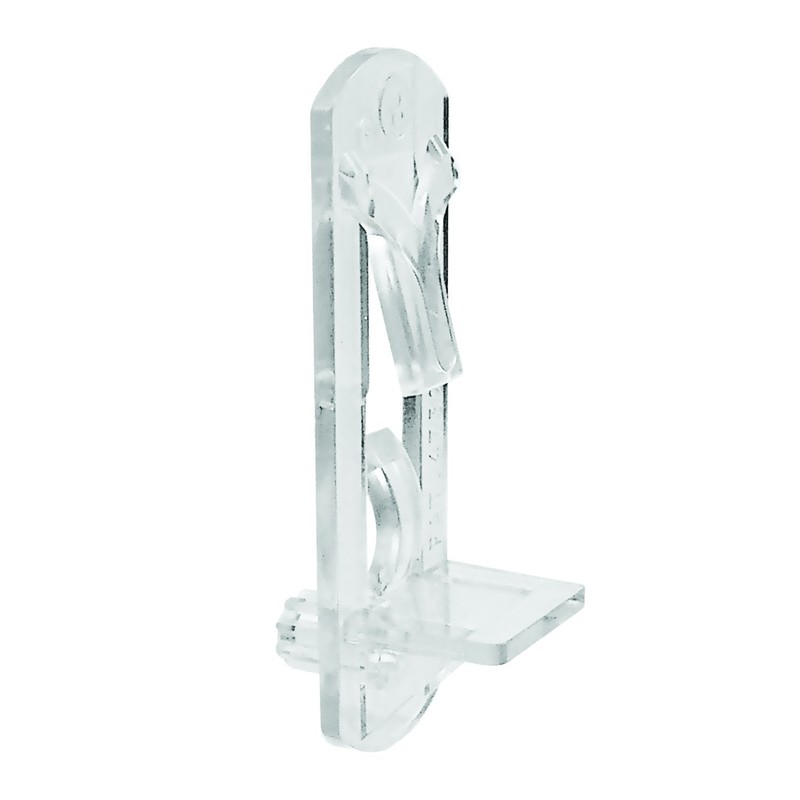 These shelf pegs are constructed of plastic and come in a clear finish for increased concealment. They are designed to receive 1/2 in. Thick shelves and can Support a maximum of 5 Lbs. Each, per peg. The Main feature of these shelf pegs is the self-locking tabs that secure the 1/2 in. Thick shelves in place, preventing tipping and rotating of shelves. The 1/4 in. Outside diameter pegs have a 5/16 in. Depth and feature serrated stems for a stronger grip. * ADJUSTMENT tip: to remove and relocate these Support pegs, the tabs which lock in the shelves must be pushed in and held in while twisting the shelf upward in a clockwise direction if lifting the shelf from the left side. If shelf will be lifted upward starting from the right side, push and hold in the locking tabs of the Support pegs (on the right) while twisting the shelf upward in a counter-clockwise direction from the right side. To accomplish this task a third or fourth hand may be required. Another option would be to slide in a couple of old credit cards or business cards in between the shelfft.s edge and the locking tab of the Support pegs... this may assist causing the locking tabs to be pressed in by the cards when pushing up on one side of the shelf. Make sure the cards to be used are no longer needed as it is possible they will scratch and no longer be useful. Once the shelf is removed from its supports, the supports can be pulled out from the cabinet and relocated to desired height.