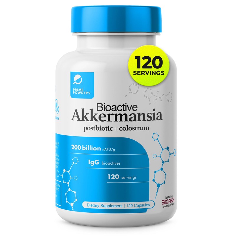 Prime Powdersยฎ Bioactive Akkermansia Probiotic, Shelf Stable Postbiotic with Colostrum Powder, Gut Health, Maximum Bioavailability and Absorption, Akkermansia Muciniphila Capsules (120 Count)