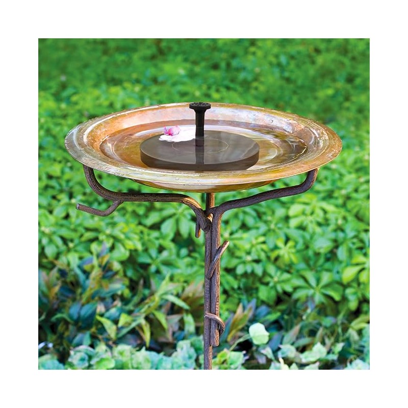 Placing this standing bath and solar fountain kit in your garden enhances its natural appeal while adding gentle sounds and movement. Ancient Graffiti Solid Copper Bird Bath with Stake has a flamed finish for a dynamic look. Basin rests easily in the included steel stand, which evokes a tree branch. Generous, 1.5" wide rim provides perching for several birds, while the 1.5" depth enables both small and large birds to use the basin. Place the included Wild Bird Lover's Solar Powered Bird Bath Fountain in the center of this bowl to create a fountain effect. Solar panels power the integrated pump, easily adding moving water to your bath. Assortment of fountain heads allows you to create different patterns with the water. Suction cups on the pump base secure the assembly to the basin with ease. Step-in base on the stand makes it simple to place this item in your yard, ensuring the panel is in full sun. Some assembly required.