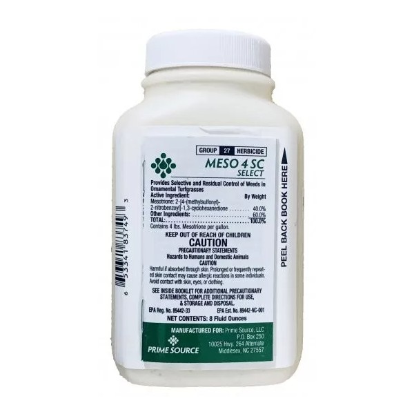 Meso 4SC Select provides both pre and post-emergence control of more than 45 broadleaf weeds and grasses in turfgrass. Meso 4SC Select inhibits photosynthesis in targeted plants and is absorbed systemically through leaves and roots. It can be effectively used for weed control prior to and when seeding of specific types of turfgrasses.