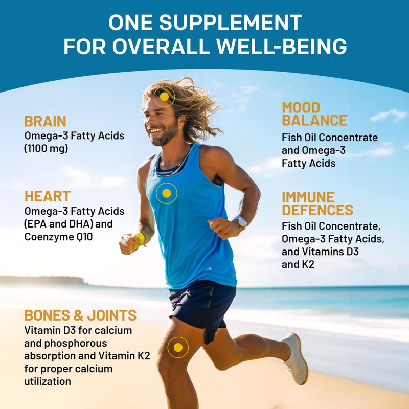 • Our Omega-3 Fish Oil blend is for those dedicated to elevating their health. It's rich in EPA and DHA, with the added benefits of CoQ10, and Vitamin D3 K2. It's an all-in-one fish oil omega 3 supplements for comprehensive well-being.