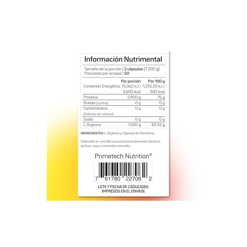 PRIMETECH NUTRITION - Primetech L-Arginina100 cápsulas con 500 mg de arginina. 💯 Autenticidad y máxima durabilidad comprobadas. Construcción robusta y atención al detalle. 🏆 Recomendado por expertos. Ideal para quienes buscan lo mejor en calidad y estilo. Producto auténtico con satisfacción total asegurada. ¡No te quedes sin el tuyo y aprovecha esta oportunidad única!