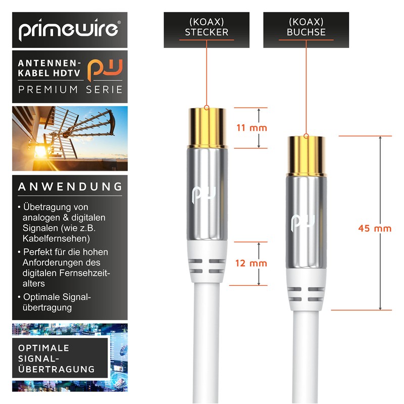 • Model name: Primewire 0.5 m premium TV antenna cable / TV (coax) plug to TV (coax) socket (straight) | transmission of analogue and digital signals such as DVB-T and DVB-T2, radio (FM/DAB/DAB+) as well as cable TV analog/digital SD/digital HD | provides a reliable connection between junction box and receiver such as TV/receiver (Sky-Recei) and radio
