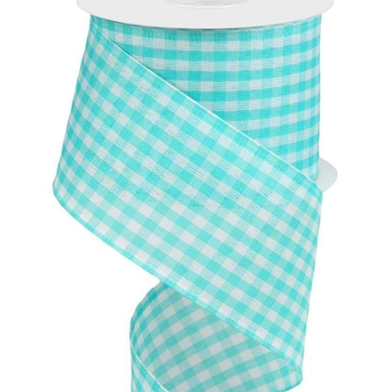 Primitive Gingham Check Wired Edge Ribbon, 10 Yards (Turquoise, White, 2.5")