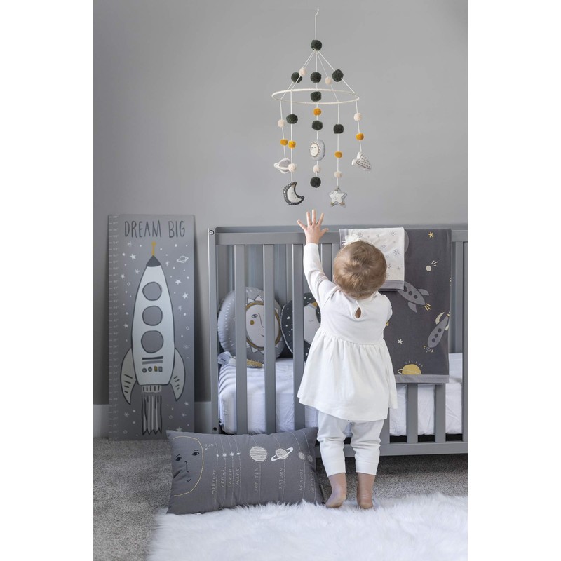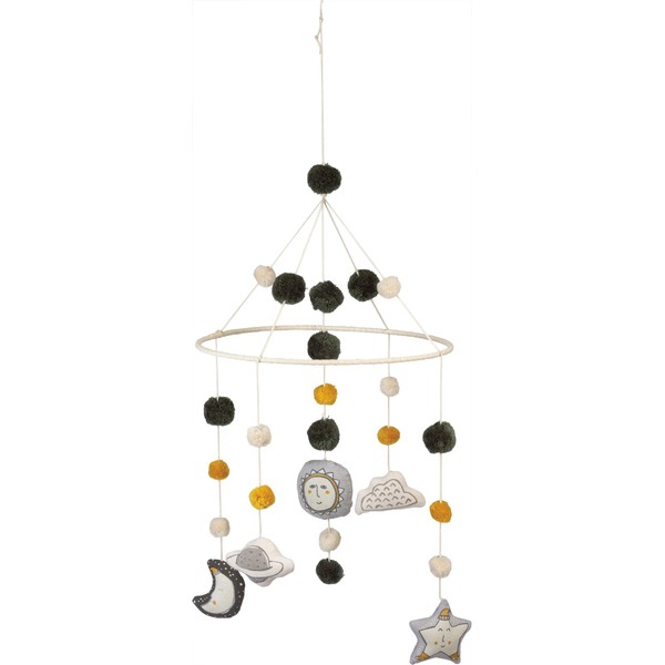 - Galaxy-themed mobile in a neutral yellow and gray palette featuring pom details, various sun, star, moon, cloud, and planet design