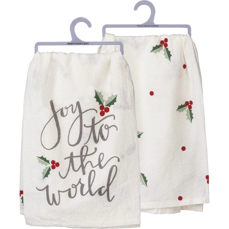 Primitives by Kathy Decorative Kitchen Towel - Joy to The World Hand Illustrated Sentiment with Festive Holly All Over Design