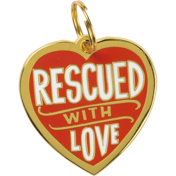 A high-quality, hard enamel collar charm featuring a "Rescued With Love" sentiment with an original, hand-illustrated design to add playful personality! Charm is attached to an illustrated dog backer card in plastic bag for easy hanging. Back of charm is safe to be engraved without damaging front enamel.