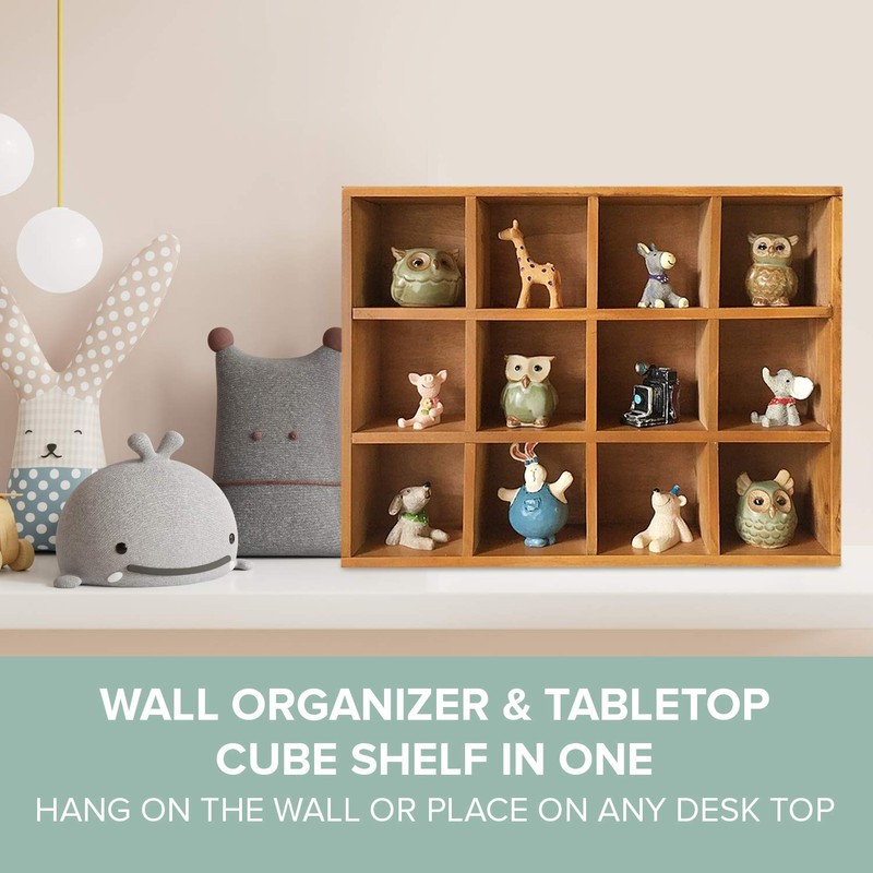 - WALL ORGANIZER & TABLETOP CUBE SHELF IN ONE: Looking for shelving units and storage solutions you can either mount on your wall or transfer to any tabletop? The cube storage display rack from Primo Supply is the solution. Our classic wood dresser display shelf features 12 slots in 3 levels that can be used in 2 ways: hung against the wall or steadily atop any desk. Our cube floating shelves even come with metal buckles for hanging