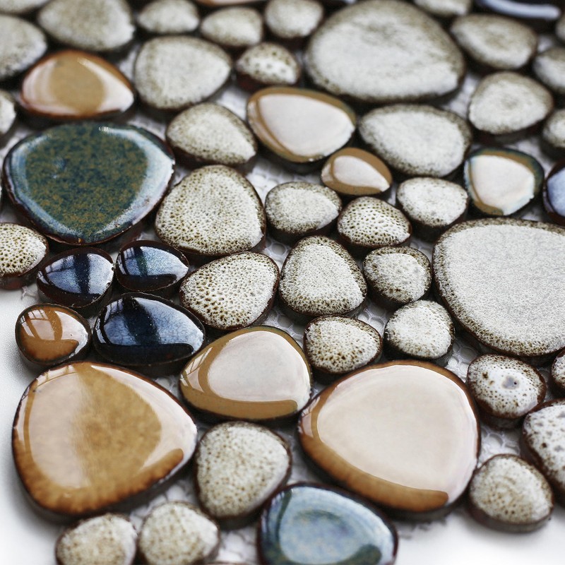 - This porcelain flooring tile mosaic is unique designed. The special beige and tan color ceramic tile is a great match for all your deco style, creating a serene of a tranquil riverbed.
