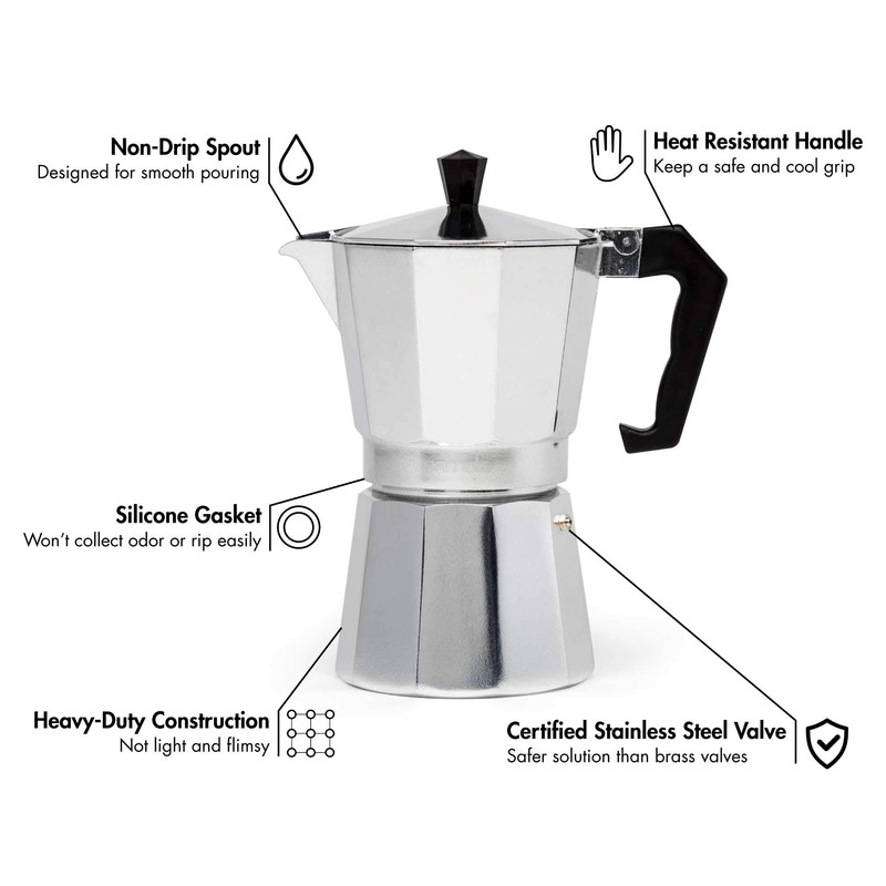 - EASY TO USE: Simply fill the lower chamber with water, add ground coffee or espresso to the filter and place on stovetop. Within minutes, delicious espresso will fill the top chamber of your moka. Remove from heat and enjoy!