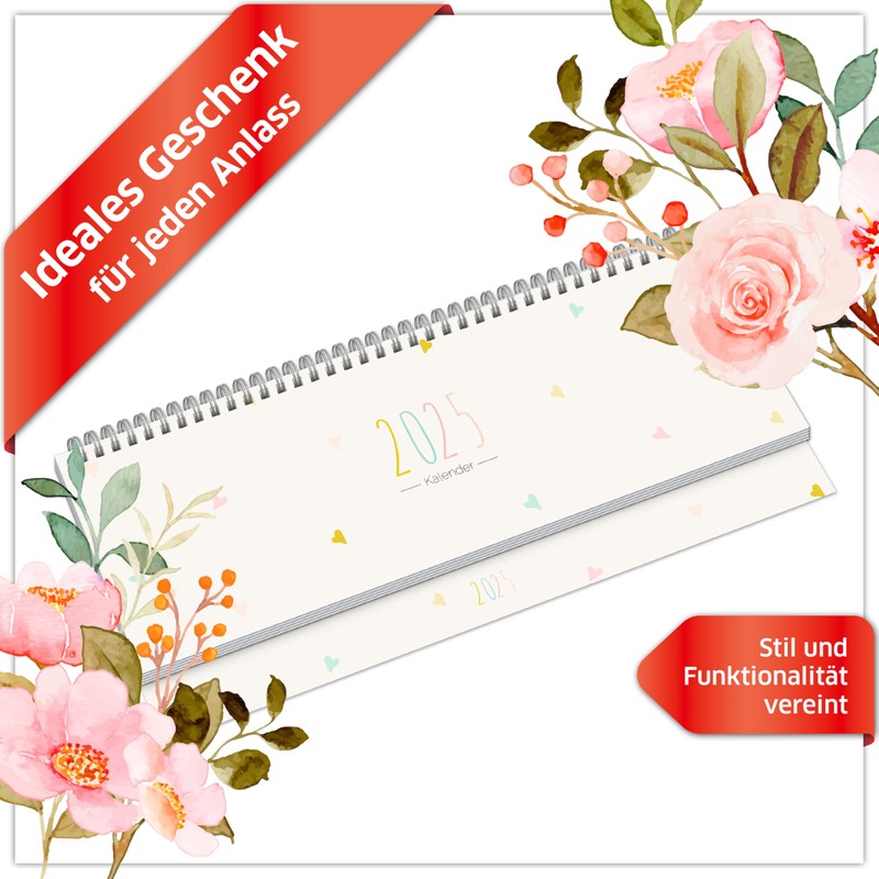 PRIMUS PRINT Desk Calendar 2025 Landscape Weekly Calendar - 112 Pages Appointment Calendar and Annual Calendar - 297 x 130 mm, 75 g Natural Paper, Wire Comb Binding, Holidays and School Holidays -