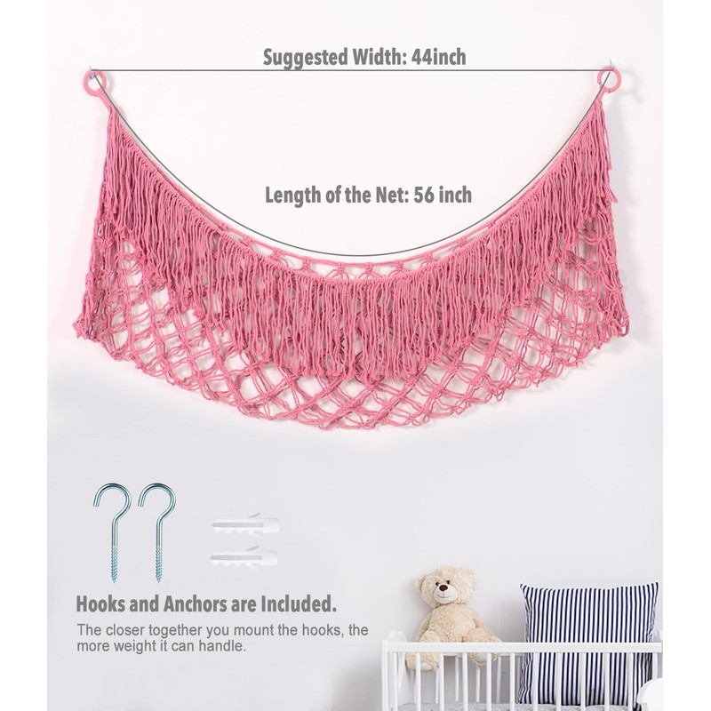 - [HANDWOVEN] This stuffed animal holder is 100% handwoven with Natural Pure Cotton Cord. It is designed to be hung on the Wall to Form a Pocket with beautiful long tassel.