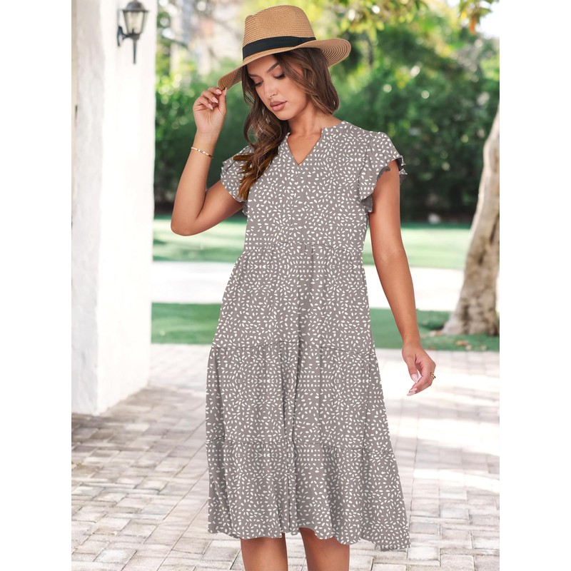 - Features - This casaul dress features ruffled sleeves, a V-neckline, a tiered midi-length design, and a flowy fit. It also includes convenient side pockets and a flattering high waist.