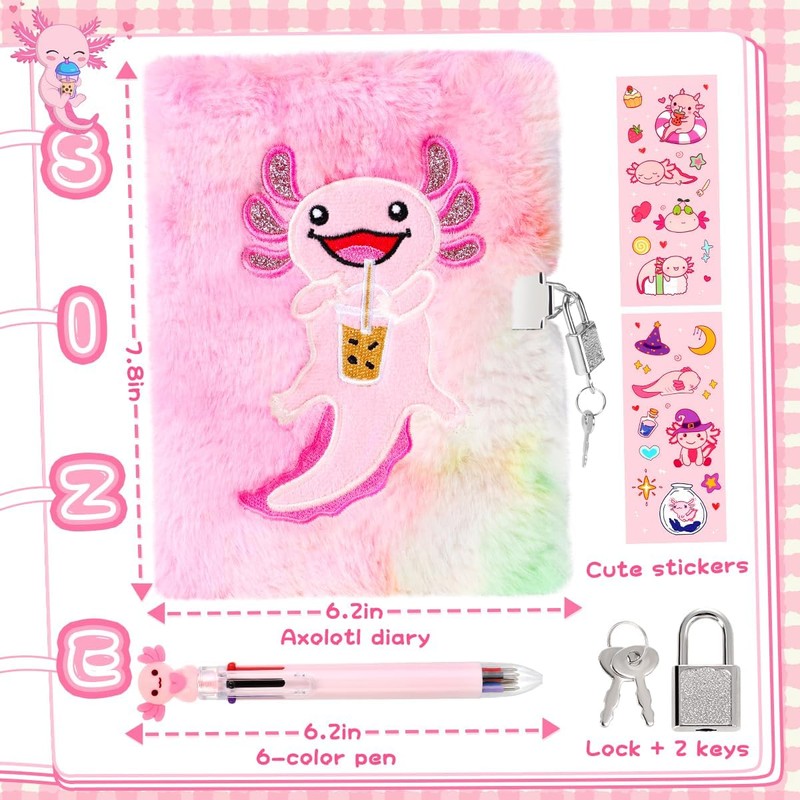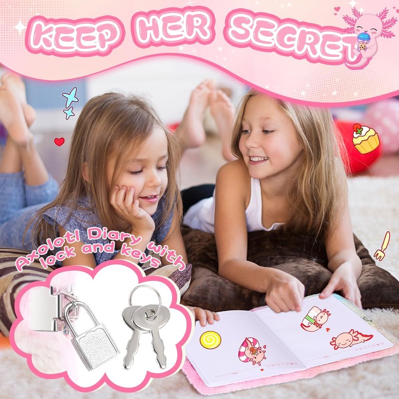 PrinBarBee Axolotl Diary For Girls With Lock And Keys, Girls Fuzzy Notebook Gift Set For Writing And Drawing