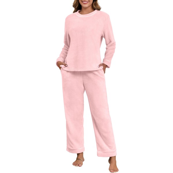 PrinStory Fluffy Pajamas for Women Winter Soft Fleece Warm Pajama Set Fuzzy Pjs Flannel 2 Piece Lounge Sets with Pockets Light Pink-XL